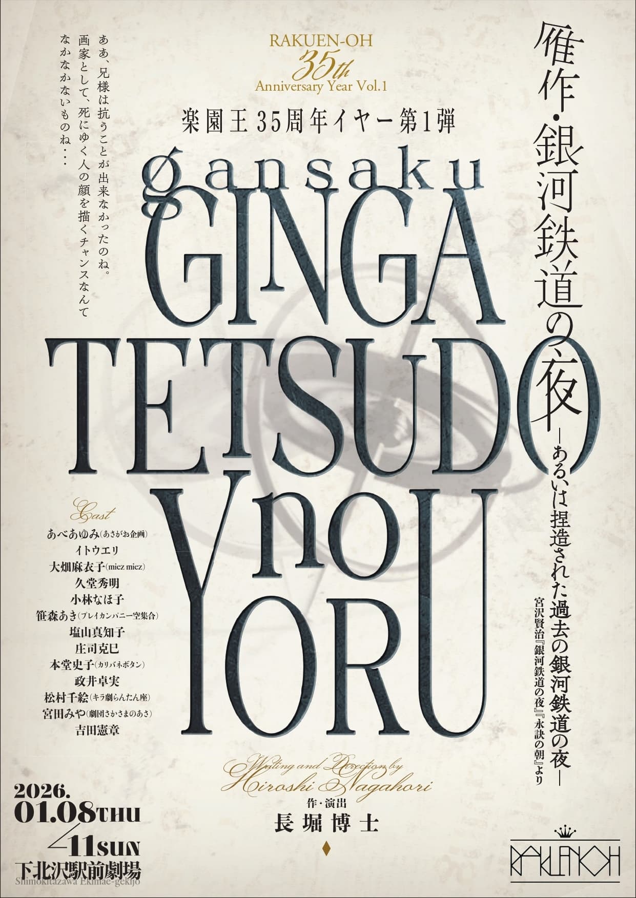 「楽園王は、ご存じのお方はご存じのように『エッシャーの絵の中に紛れ込んだよう』と評される劇団で、1991年に旗揚げしました。平成3年、ソ連が崩壊した世界史上の大きな転換点として知られる年です。世界が大きく変わる、という機運があり、それに背中を押されて楽園王はスタートしました。2026年、この年が35周年になります。その記念すべき年の最初の最初の時期、1月に、久しぶりに迷路のような長編最新作を上演します。実は『死を描く』と仮題して書き始めた物語が、あれよあれよと言う間に銀河鉄道の夜の雁作へと変容してしまいまして。変妖? なんか不思議な物語が出来ました。劇団の代表作に『銀河鉄道の夜』があるカンパニーの、今度は思いっきり『雁作』です。年初めの観劇としてきっと最適ですので、ぜひご期待ください。楽園王、日暮里d-倉庫の閉館公演だった『脱兎を追う』以来の長編で、また、下北沢駅前劇場は25周年の『物語』以来なので10年ぶりになります。劇場にお越しいただけることを心から願っています。どうぞよろしくお願いいたします。さあ、楽園王35周年イヤーがこの公演からスタートします!! 」